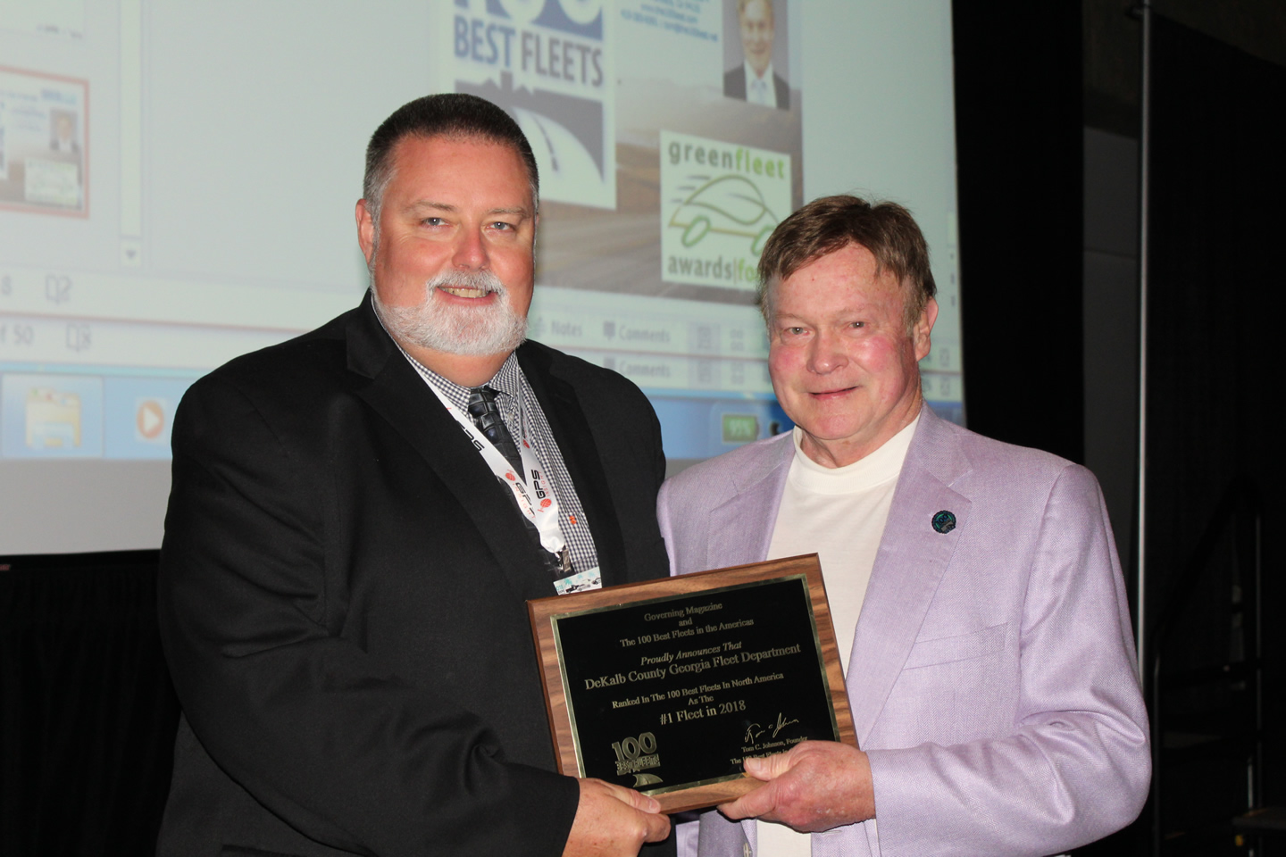 Robert Gordon, fleet director for Dekalb County, GA (left) receives his award as top recipient  of The 100 Best Fleets in the Americas from Tom C. Johnson, Author of The 100 Best Fleets contest (right).
