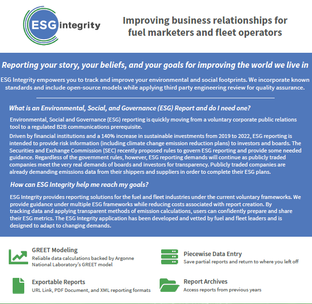 Designed by ESG integrity, a program developed by the Fuels Institute, the ESGi application allows fleet managers to confidently track and share their organization’s fleet operations ESG metrics, assisting the fuels and transportation industries with meeting the growing demand for ESG planning and reporting.